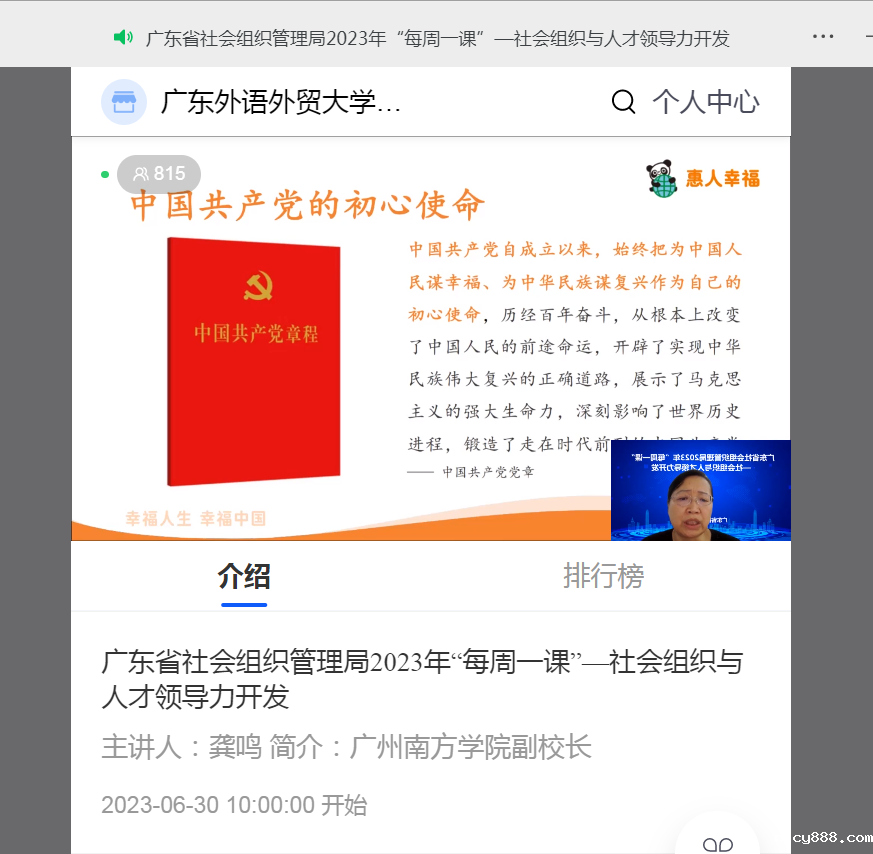 6月30日观看学习由广东南方学院副校长龚鸣讲解的“社会组织与人才领导力开发”,课程依据社会组织特点,探讨社会组织与人才领导力开发目标、文化、理论、方法等,助力社会组织高质量发展。