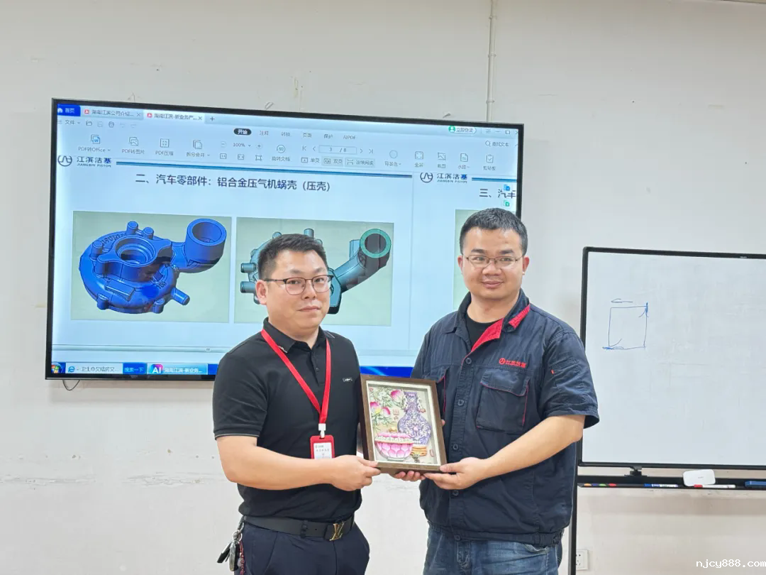 该公司目前开发了一些新能源汽车高压和低压压铸模具,与本次考察团成员企业高度吻合,就技术上和业务上展开了深入的交流和探讨,并对北京精雕的设备加工技术和解决方案产生了浓厚的兴趣。