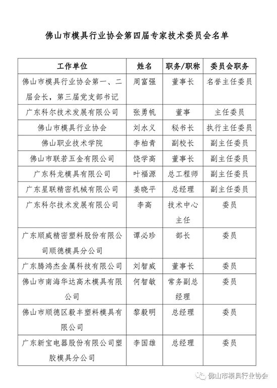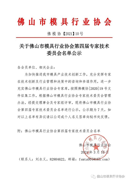 为加快推进我市模具产业技术创新工作,充分发挥专家在技术创新及行业管理和决策中的咨询和参谋作用,进一步充实18luck最新专家库,按照佛模协[2020]19号文件征集工作,根据18luck最新专家技术委员会管理办法,经提交理事会及专家组评审,现将18luck最新第四届专家技术委员会名单进行公示,公示期为7天,如对以上名单有异议请以公司或个人名义签章向秘书处反馈。
