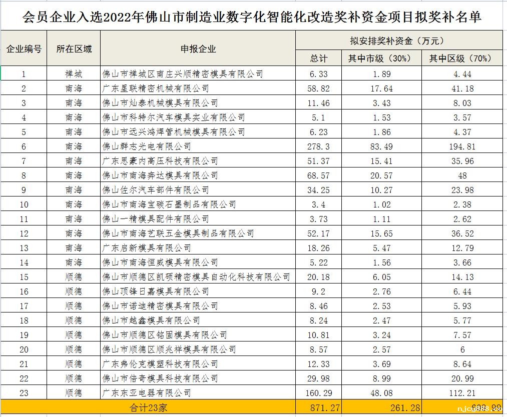佛山市工业和信息化局关于2022年佛山市制造业数字化智能化改造奖补资金项目拟奖补名单的公示