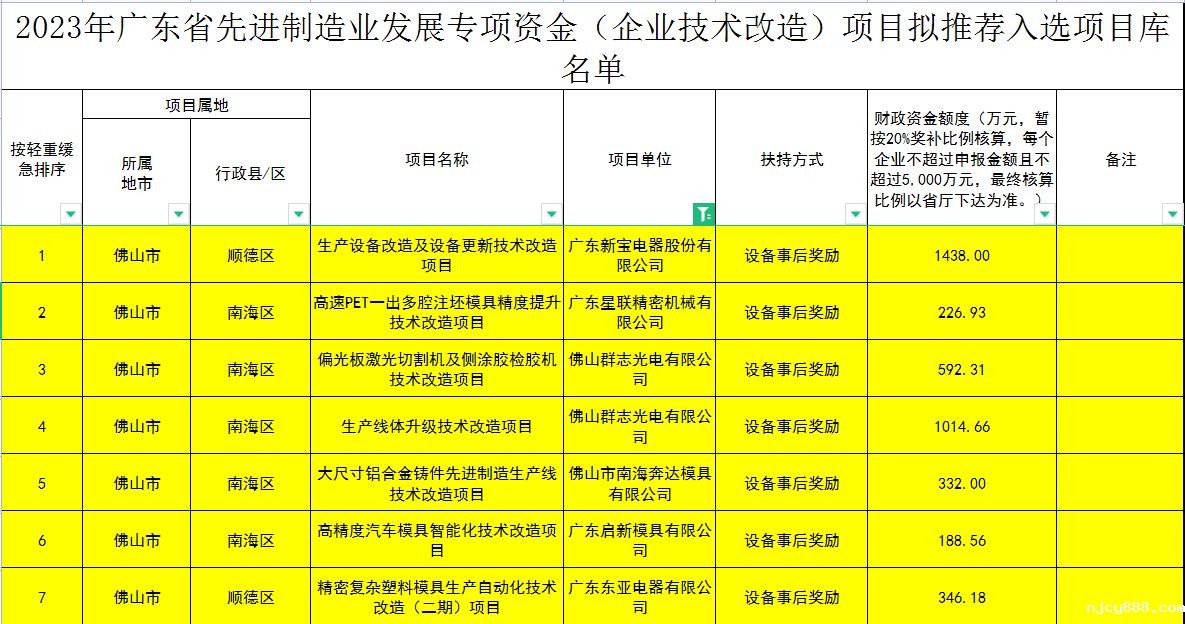 我协会多项技术改造项目入选的企业有:广东新宝电器股份有限公司、广东星联精密机械有限公司、佛山群志光电有限公司、佛山市南海奔达模具有限公司、广东启新模具有限公司、广东东亚电器有限公司。